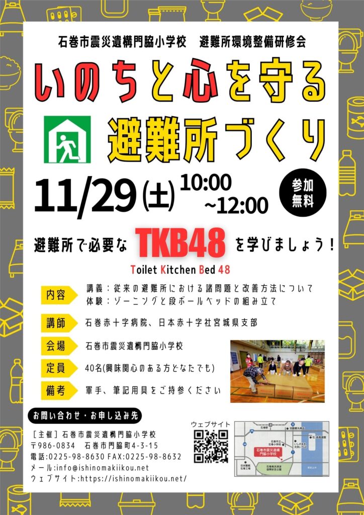 震災遺構門脇小学校では、2025年11月29日(土)に本年度1回目となる避難所環境整備研修会を開催します。