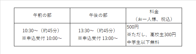 申し込み:当日、実施時刻の30分前から大川震災伝承館窓口で受け付けます。定員は30名で、事前予約はできません。